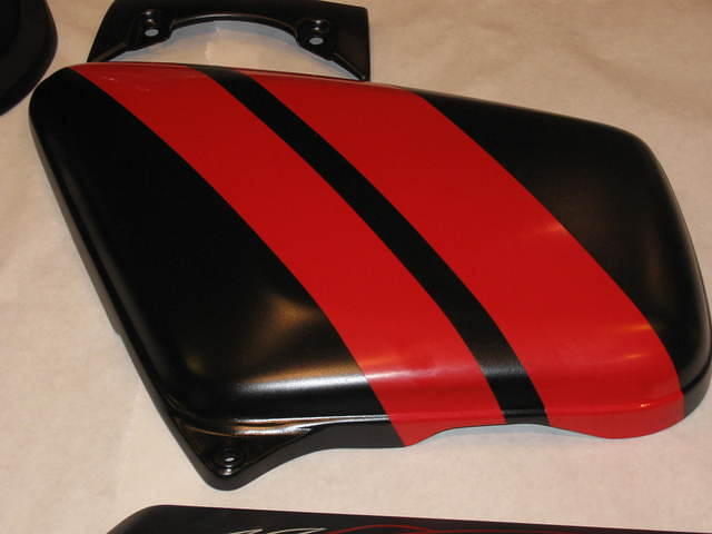 I worked on the 1996 Grand Sport Corvette as a Design Responsible Engineer. I worked on the 1996 Grand Sport Corvette, so to pay a bit of homage to the 1966 Grand Sport Covettes raced by the Mercom team I added hash marks to my side covers. Painted the cover gloss red, polished the rattle can paint to a high gloss, then taped over what I wanted as stripes and painted the cover satin black. This clearly leaves an offset between the red and black, and as the look is to be tape, the offset is a nice feature imo.